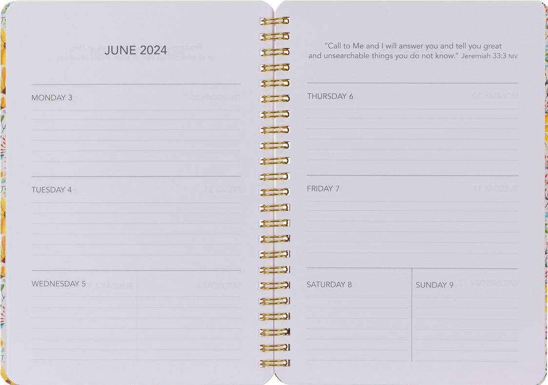 2024 Make Today a Wonderful Day The interior pages feature a full-page year-at-a-glance view of 2024, a list of public holidays, and space to record personal information, followed by weekly planning pages for each week of the year. Every weekly planning page features each day of the week with a lined space to record appointments or notes. A weekly Scripture verse is included to inspire and motivate you, and dot-grid pages in the back of the planner provide space for creative note-taking. The back of the planner also has room to record contacts. The bronze-toned wire binding makes this a sturdy planner that can open flat and fold over easily. Start your day with happy and positive thoughts when you open your schedule to take on the errands and appointments recorded on the pages of the Weekly Planner, or share your positive outlook by giving the Weekly Planner as a back-to-school gift for a teacher or student.
