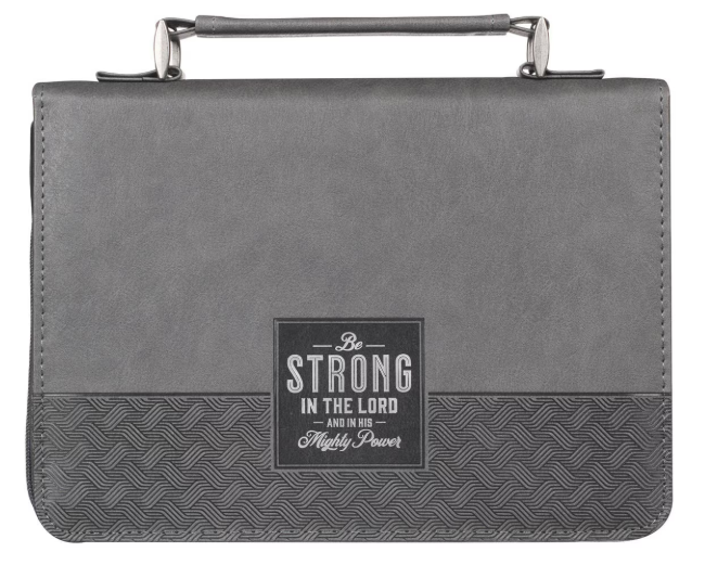 The Be Strong in the LORD Gray and Black Faux Leather Classic Bible Cover is the perfect Bible case to protect your son's Bible. With its bold call to stand firm in the faith and a nudge to put on the full armor of God, this Bible cover will encourage your son to stand for truth. The gray faux leather Bible case showcases a heat-debossed band with a geometric wave pattern running horizontally along the bottom of the front panel. A heat-debossed frame overlaps both the gray panel and the geometric design and displays the sentiment in elegant silver-foiled letters. Be strong in the LORD and in his mighty power Ephesians 6:10 (NIV) A silver metal zipper pull engraved with a cross is attached to the black zipper that securely closes the covers. Silver metal handle hardware secures the lay-flat faux leather handle and coordinates with the silver foiled details of the cover design. Topstitching along the cover's edges and seams adds strength and durability to a handsome design. A slip pocket on the back panel is handy for storing notes or a slim notebook and is heat-debossed with the Scripture reference. Ephesians six-ten Inside the Bible case, two slip pockets securely hold the cover of your Bible, and two elastic pen loops are included to hold writing instruments. The Be Strong in the LORD Gray and Black Faux Leather Classic Bible Cover is available in three sizes: medium, large, and extra-large. Please refer to the last image in the image carousel on the left for the Bible Cover Sizing Chart before you make a selection. Give your son a Bible cover that will protect his Bible and a message that will preserve his faith when you give the Be Strong in the LORD Gray and Black Faux Leather Classic Bible Cover as a birthday gift.