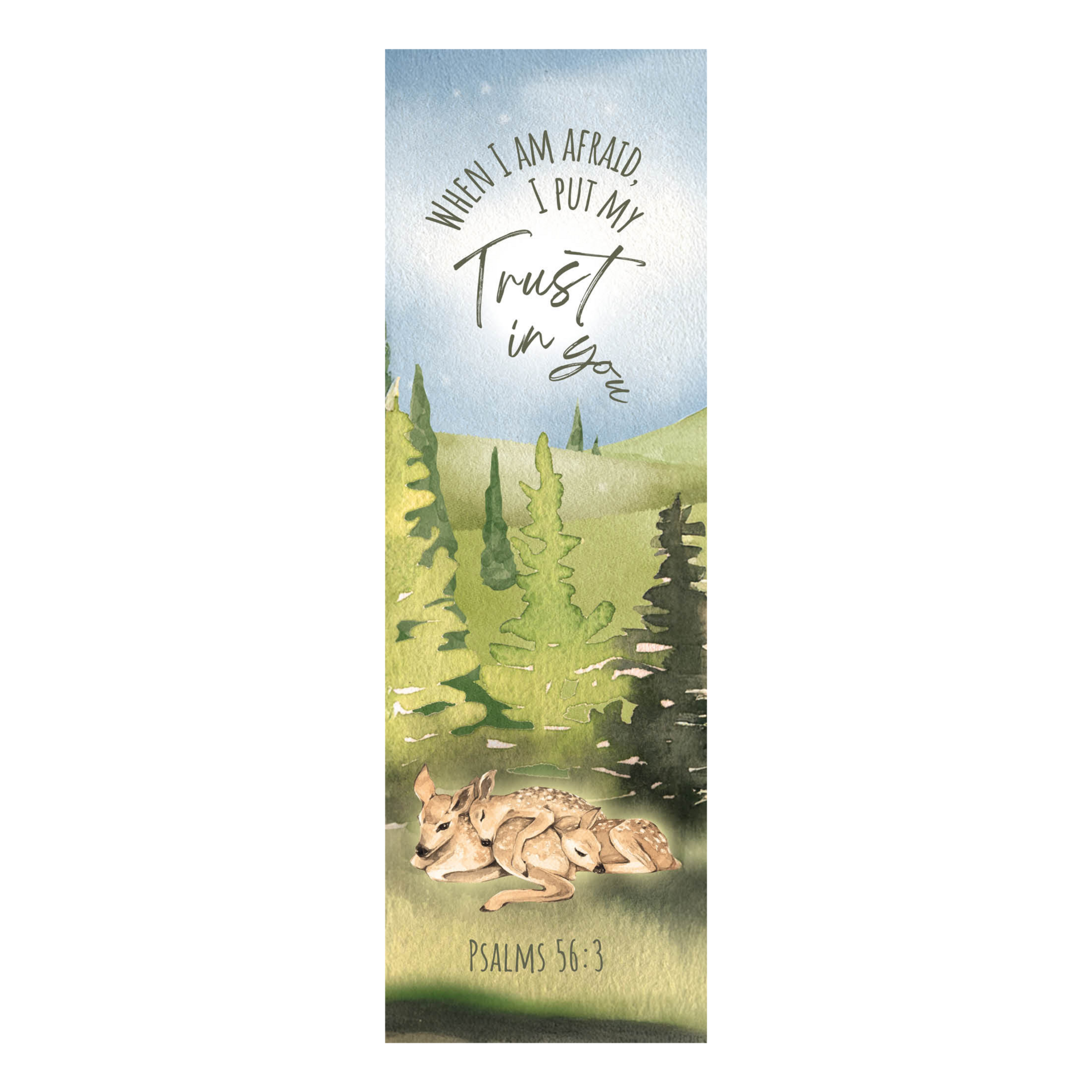 Laat je hart bemoedigen door de krachtige woorden uit Psalm 56:3 op deze boekenlegger. Het hertje dat uitrust in de groene wei, straalt rust en vertrouwen uit. Het herinnert je eraan dat je op angstig