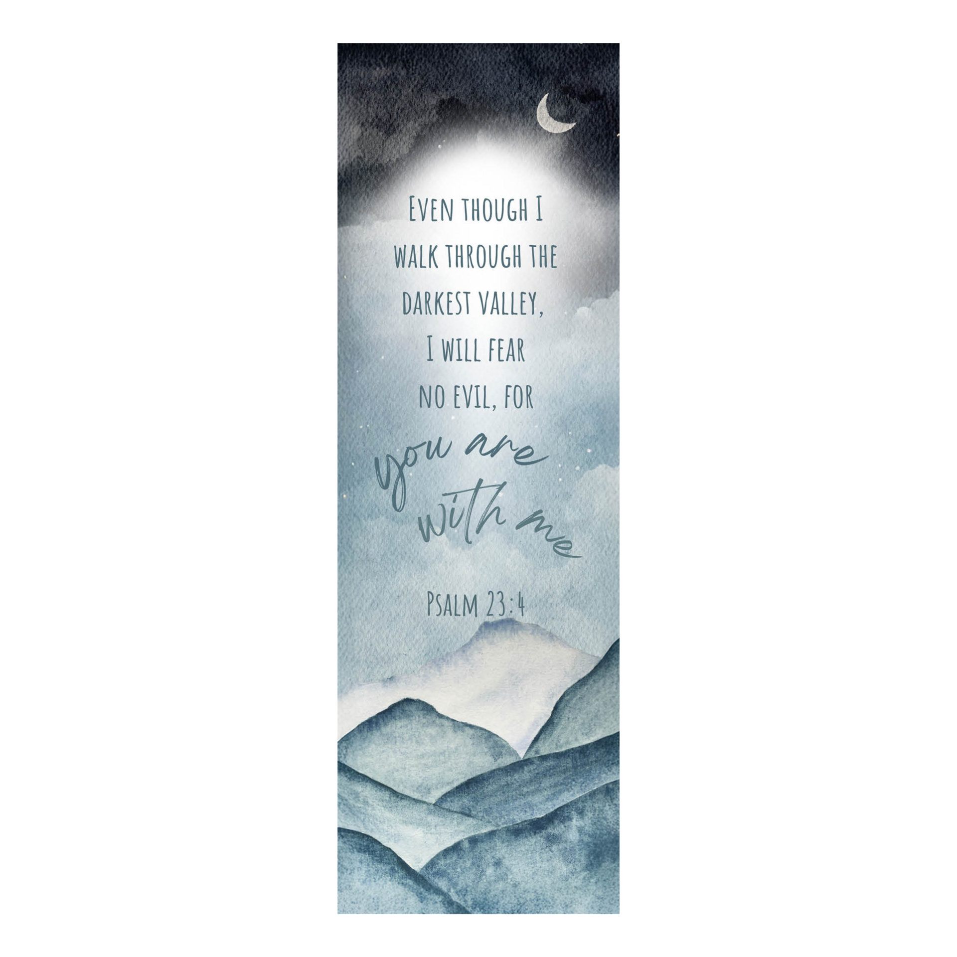 Laat je troosten door de vertrouwde woorden van Psalm 23:4. Deze boekenlegger weerspiegelt de vrede en bescherming die God geeft, zelfs in de donkerste dalen van het leven. Het licht staat symbool voo