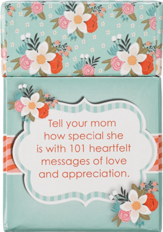 Just for Moms, these are 51, playing card sized, inspirational messages in a box. Each card is printed both on the front and the back. Give all at once to draw from for inspiration, or keep a box to tuck a blessing into a lunch bag, briefcase, travel bag, pocket or purse. Your small gift will be received with smiles and thanksgiving for your thoughtfulness. Cards come packed in a sturdy, lidded box. The set has uniquely designed artwork and a message theme for moms. Box Size: 3.8" x 2.7" x 1.1" (97 x 69 x 28mm) Card Size: 3.4" x 2.3" (87 x 58mm)