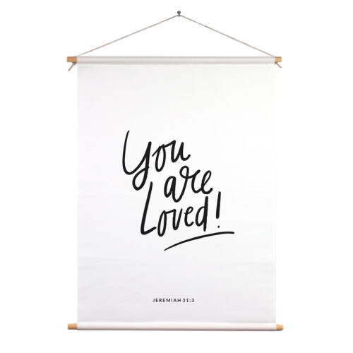 Een mooie christelijke textielposter met de handgeschreven tekst :”You are loved!”, naar aanleiding van Jeremia 3:3. Een stijlvolle poster met zo’n waardevolle tekst, waar je jezelf iedere dag aan mag
