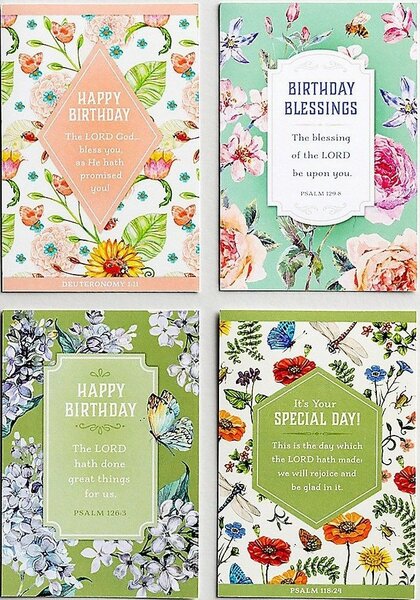 • King James Version Scripture text • Folded card size: 11,43 x 16,67 cm Card 1 Cover: Birthday Blessings The blessing of the LORD be upon you. Psalm 129:8 Inside: Thinking of you on your birthday and praying your day is blessed! Happy Birthday Card 2 Cover: It’s Your special day! This is the day which the LORD hath made; we will rejoice and be glad in it. Psalm 118:24 Inside: Hope your birthday is full of fun today and a joy to remember tomorrow. Card 3 Cover: Happy Birthday The LORD God... bless you, as He hath promised you! Deuteronomy 1:11 Inside: Praying your day begins with sunshine and ends with a heart full of blessings. Card 4 Cover: Happy Birthday The LORD hath done great things for us. – Psalm 126:3 Inside: Bask in the joy of this happy day! May all things beautiful come your way. Happiest of Birthdays
