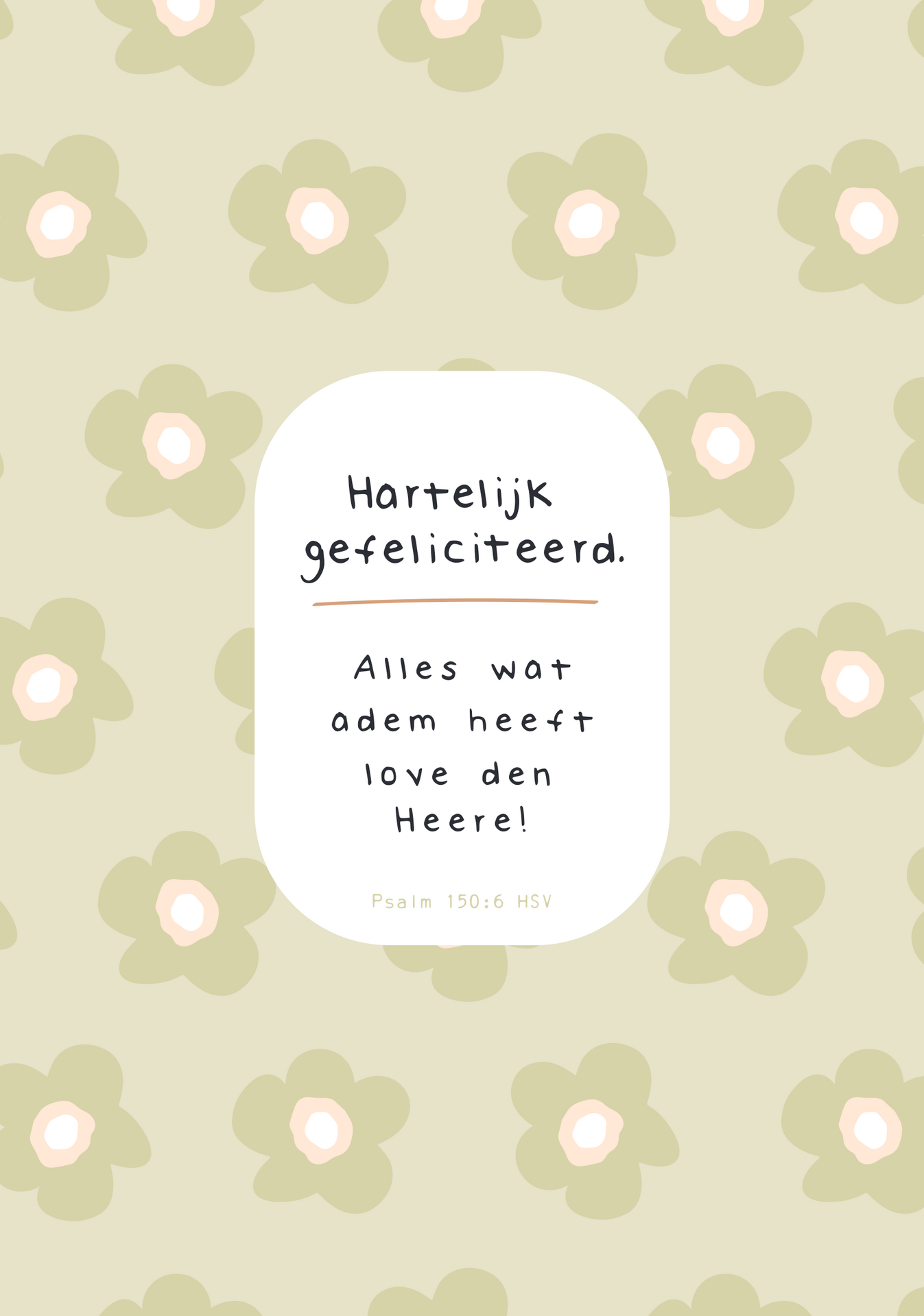Christelijke enkele kaart aan de hand van Psalm 150:6 "Hartelijk gefeliciteerd. Alles wat adem heeft love den Heere." gedrukt op duurzaam en stevig 300 grams papier met een matte look.