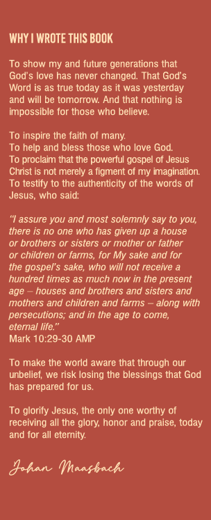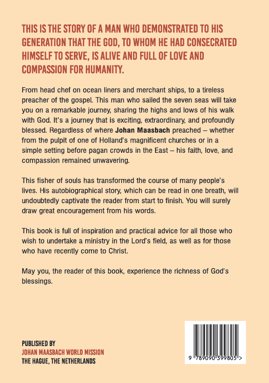 From head chef on ocean liners and merchant ships, to a tireless preacher of the gospel. This man who sailed the seven seas will take you on a remarkable journey, sharing the highs and lows of his walk with God. It's a journey that is exciting, extraordinary, and profoundly blessed. Regardless of where Johan Maasbach preached – whether from the pulpit of one of Holland's magnificent churches or in a simple setting before pagan crowds in the East – his faith, love, and compassion remained unwavering.