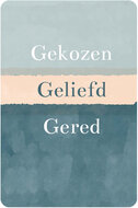 Leuk minikaartje met de tekst ‘Gekozen, geliefd, gered’. Perfect om een persoonlijke boodschap toe te voegen aan je cadeau of om een liefdevolle boodschap aan een geliefde te schrijven. De kaarten hebben een blanco achterzijde, zodat deze goed beschreven kan worden.