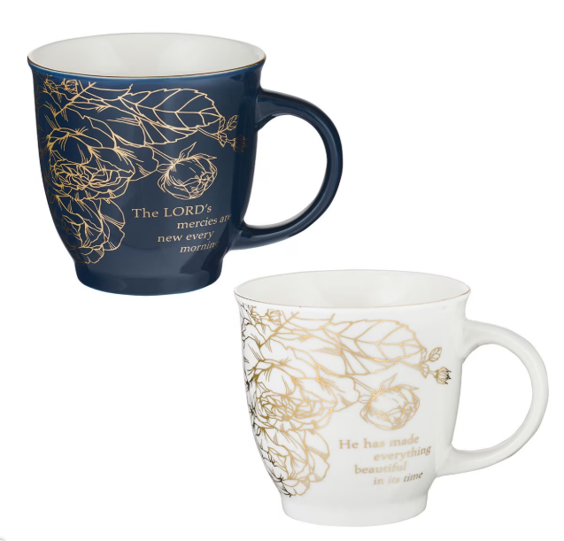 Women of all ages will appreciate receiving this exquisite 2-piece A Beautiful Morning Ceramic Mug Set as a birthday gift, hostess or thank you-gift, or gift for any occasion. The deep midnight blue mug has a luxurious ivory interior. He has made everything beautiful in its time from Ecclesiastes 3:11, appears near the base in gold foiled lettering. The second mug is colored in warm ivory inside and out with The Lord’s mercies are new every morning from Lamentations 3:23, appearing near the mug’s base also in gold foil lettering. Both feature a stunning gold foil floral design, reminiscent of cloisonné, that spans the front and back surfaces of these elegant ceramic mugs. These generously sized mugs have small bases and wide, flared mouths rimmed in gold foil. Three fingers can slide easily into the handles for a secure and comfortable hold. Any time is the perfect time to bless your friend, co-worker, Bible study teacher, or any woman in your life with a reminder of God’s faithfulness and compassion, and this A Beautiful Morning Ceramic Mug Set will do just that.