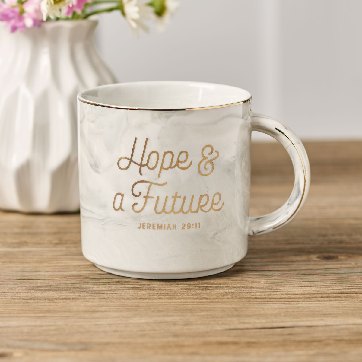 Drink to a new beginning when you sip from the Hope and a Future White Ceramic Coffee Mug! This mug promises that God has your future in the palm of His hands, so you need not fear. The exterior of the ceramic coffee mug is covered in a white and gray marbled design that is elevated by gold-foiled title accents.