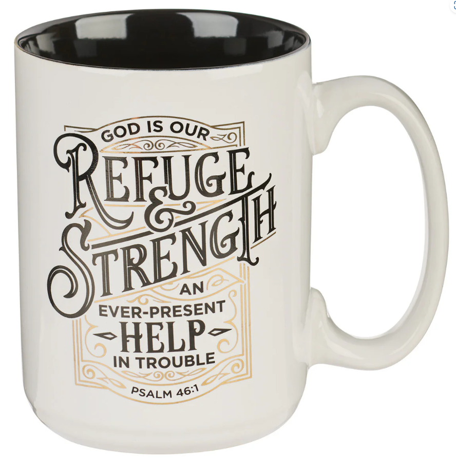 Let the words of the Refuge and Strength White Ceramic Coffee Mug become your morning affirmation and prayer as you prepare to take on the new day filled with its challenges. The glossy black interior of the ceramic coffee mug forms a stark contrast to its creamy white exterior, where the sentiment is presented in a black typographical design framed with an ornate gold-foiled frame. God is our refuge and strength, an ever-present help in trouble. Psalm 46:1 The handsome mug holds 14 fluid ounces and comes packaged in a gift box. A comfortable handle that easily fits three fingers extends to the side and ensures a firm grip. Due to the delicate foiled accents used in the decoration, the mug should not be used in a microwave, and we recommend handwashing it in warm soapy water. The Refuge and Strength White Ceramic Coffee Mug is part of the Black Woodgrain Refuge and Strength Collection, designed to encourage men and women alike to walk by faith. This collection also includes a wirebound journal and a reusable shopping bag. Find the boldness to face any circumstance when you take the words of the Refuge and Strength White Ceramic Coffee Mug to heart and believe it. Encourage a father on Father's Day when you give the Refuge and Strength White Ceramic Coffee Mug as an encouraging gift.