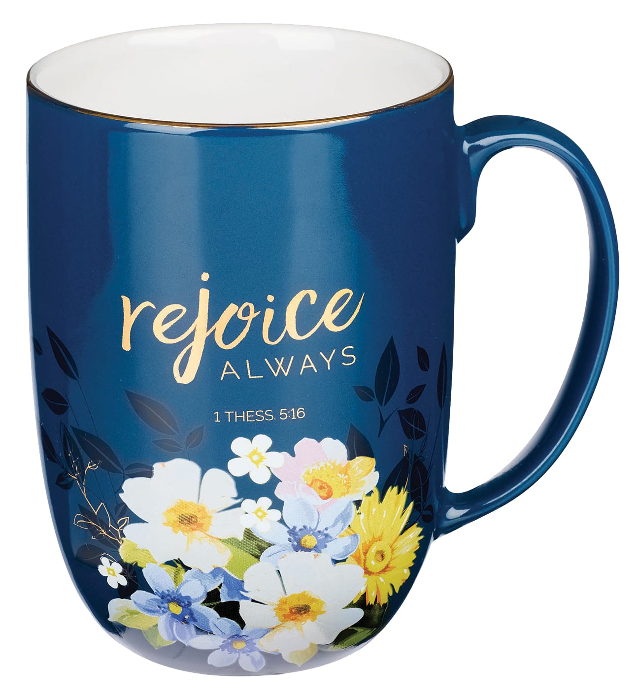 The Rejoice Always Blue Ceramic Coffee Mug reminds us to posture our hearts in praise. God is forever perfect, faithful, and loving, and worthy of our rejoicing in Him—a message you can reflect on as you sip from this cup. A collection of bright white and yellow flowers peeks up in front of the rich blue background of this ceramic mug. The sentiment is displayed in a friendly gold foiled script that sits in the center, accented by the gold foil rim running around the top of the mug. Rejoice Always 1 Thessalonians 5:16 The stark white interior provides a striking contrast to the glossy blue exterior glaze of the mug. With its tall shape, this mug can hold up to 15 fluid ounces of any warm beverage. Ensure that you handwash this mug and avoid using it in the microwave to maintain the beauty of its gold foil accents. Gift the Rejoice Always Blue Ceramic Coffee Mug to a woman in your life with a classic sense of style who exemplifies a heart of gratitude in the way she lives. The Rejoice Always Blue Ceramic Coffee Mug makes a meaningful Christmas or birthday gift for a friend that inspires you with her positive attitude. Colorful floral design against a blue background