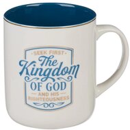 Mooie keramische mok met tekstverwijzing uit Mattheüs 6:33: "But seek first His kingdom and His righteousness, and all these things will be given to you as well". De letters zijn stijlvol vormgegeven in de kleur blauw en goudfolie. Tip: Leuk om te geven als cadeau aan je vader!