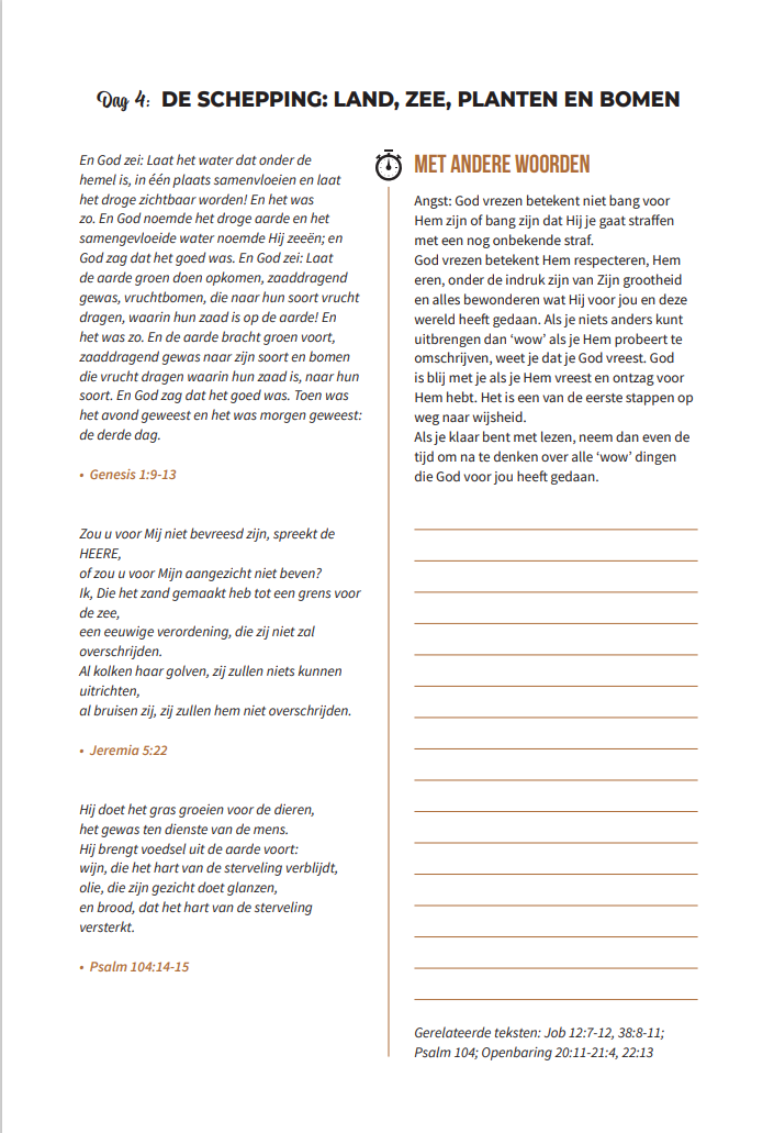 De One Minute Bijbel maakt het dagelijkse bijbellezen weer haalbaar door een nauwkeurige selectie van sleutelteksten uit de Bijbel te nemen. Van Genesis tot Openbaring – 366 één minuut stukjes om te lezen. Aan het eind van elke dag worden verwijsteksten genoemd die gelezen kunnen worden voor extra verdieping bij de thema’s die in het dagstukje aan de orde komen. In totaal worden achttienhonderd verwijsteksten uit de Herziene Statenvertaling genoemd. Daarnaast bevat elke dag een korte, meditatieve gedachte en toepassing die wil inspireren, bemoedigen en uitdagen in de dagelijkse wandel met God. Benieuwd hoe de hoofdstukken zijn opgebouwd? Speciaal voor jou hebben we een fragment waardoor je Formaat: 15×22 cm
