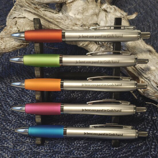 Geweldige balpen met tekst :"Je bent een parel in Gods hand" Zilverkleurige balpen met rubberen grip zone Inktkleur: blauw diverse kleuren leverbaar Materiaal: kunststof
