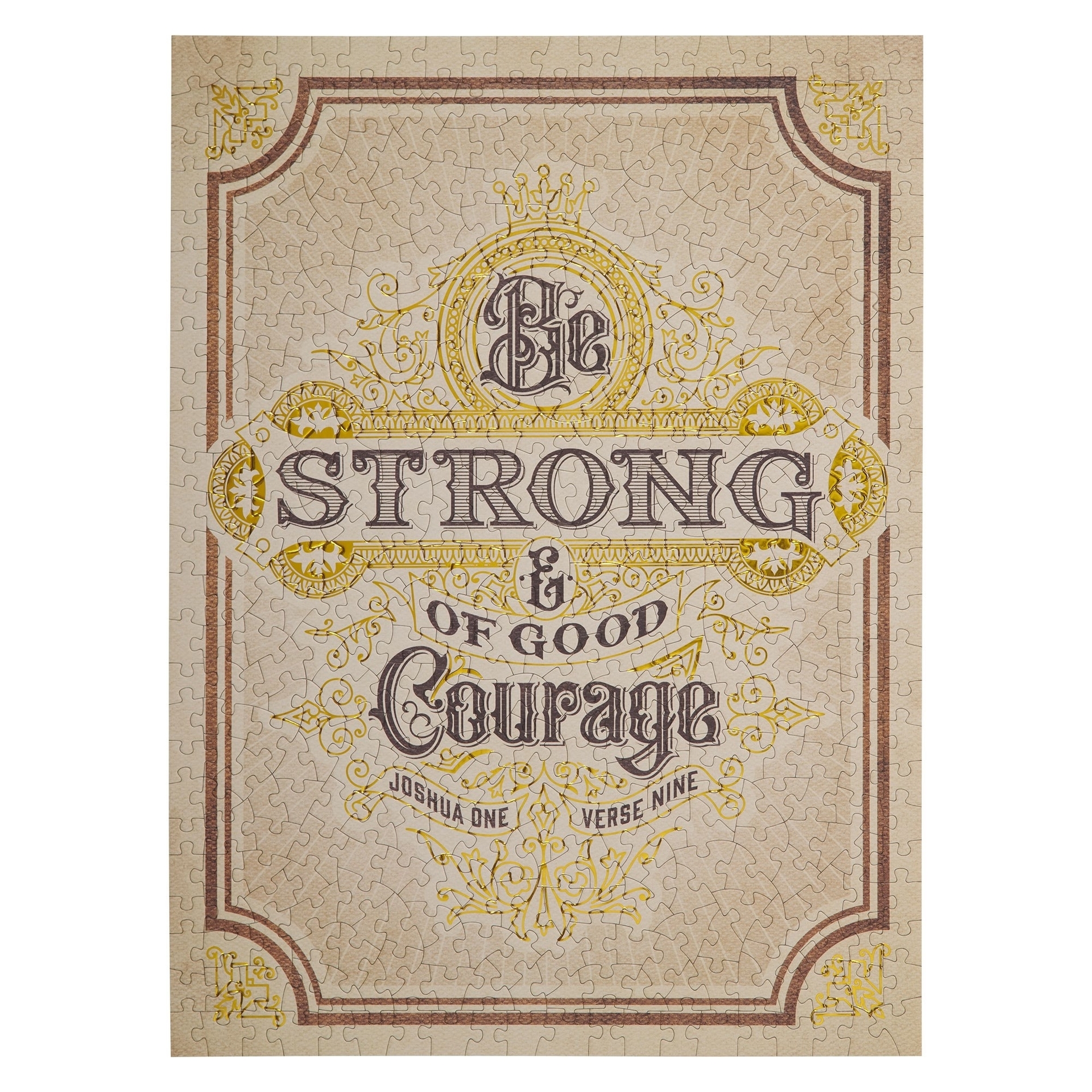 The Be Strong and of Good Courage 500-piece Jigsaw Puzzle provides an ideal mix of entertainment and inspiration. It is a fantastic choice for family game nights or times of quiet contemplation. Assembling this puzzle is a relaxing way to engage your brain and a meaningful opportunity to contemplate the guidance and purpose that God has set before you. The jigsaw puzzle features an elegant typographic design showcasing a Scripture verse from the King James Version of the Book of Joshua. This design is framed by a notched brown border embellished with gold-foiled corners. Intricate gold-foiled details are skillfully integrated into the typographic design to add even more luster to the design. The Scripture itself is printed in a gray font that stands out against the sand-colored background. Br strong and of good courage Joshua 1:9 The puzzle is crafted from recycled materials and printed with eco-friendly inks. Its 500 smoothly interlocking pieces make it an excellent way to engage the whole family in a fun and cooperative activity. After enjoying the puzzle, you can easily store it in its attractive, full-color printed box. Could there be a more delightful family Christmas gift than the Be Strong and of Good Courage 500-piece Jigsaw Puzzle? Embrace a heartwarming new tradition this holiday season by inviting your family to come together over this puzzle, creating memories and sharing laughter. With its inspiring message, the Be Strong and of Good Courage 500-piece Jigsaw Puzzle promises to add a touch of joy and contemplation to your festive celebrations.