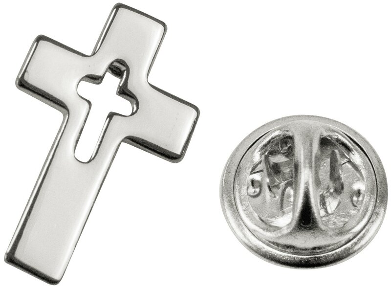 Een zilverkleurig kruis ca. 1,5 cm x 2 cm. Fijne speld, op een representatieve kaart. Het christelijke symbool staat op de achterkant van de kaart uitgelegd (in Duits). De metalen pin is niet alleen in hoge kwaliteit geproduceerd, maar is ook individueel verpakt in folie.