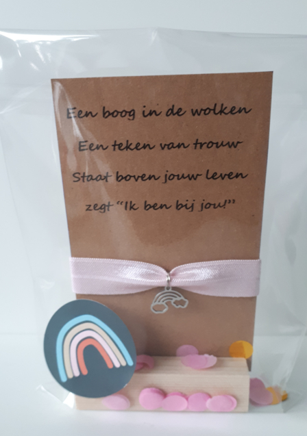 Superschattig cadeautje! Dit stieken armbandje met een stalen bedeltje van een regenboog in de wolken, leuk op een tekstkaartje in een blokje en feestelijk verpakt.Â