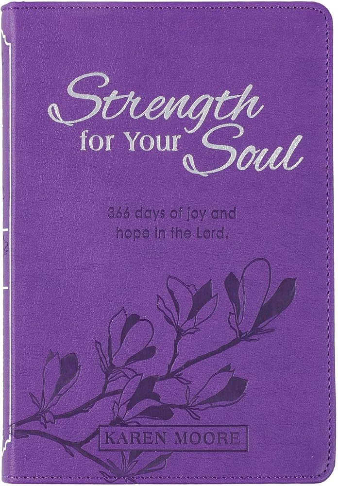 The Strength For Your Soul Purple Faux Leather Devotional offers an invitation to commune with God. This devotional encourages you to give all your worries and cares to the One who strengthens you. In His strength, you can face anything as long as you hold tight to the promises He has given you. A delightful purple faux leather cover is decorated with a heat debossed branch in full bloom. The striking title is silver foiled, and the subtitle is subtly heat debossed. Strength For Your Soul 366 days of joy and hope in the LORD 366 faith-filled devotions will draw you into a closer relationship with Jesus, the true Source of strength and joy. Each day offers a Scripture verse, a reflection, and ends with a prayer or quote. Locate the right day easily and mark it with the purple satin ribbon marker included for this purpose. Silver gilt-edged pages elevate this purple faux leather devotional to a treasure. Bestselling author Karen Moore has authored over 100 inspirational daily devotionals and is a keynote speaker for writing conferences and women's groups. The Strength For Your Soul Purple Faux Leather Devotional has a presentation page in the front that allows you to write a personal note when you give it as a gift to a sister, friend, or Bible study leader. The Strength For Your Soul Purple Faux Leather Devotional will be a much-appreciated gift and is perfect to give on a birthday, as a farewell or thank-you gift.