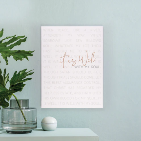 This authentic, wrapped canvas features a bright splash of color against a pure white backdrop, creating a dramatic presentation. Solid, well-constructed frames result in clean lines and straight edges. Hang from a nail or prop against a wall for display. Text:It Is Well With My Soul Canvas Decor Type: Canvas Size: 30,5 cmW x 40 cmH x 1,9 cmD