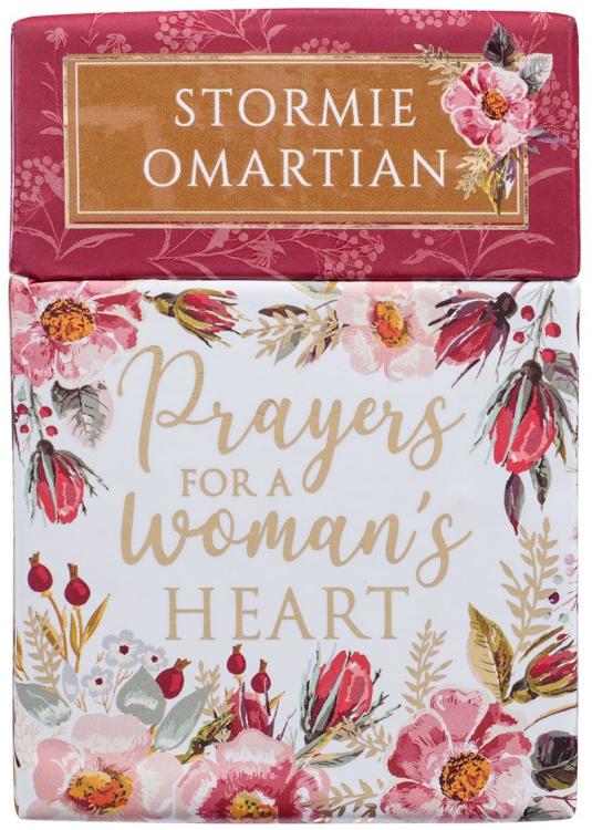 The maroon lid of the Box of Blessings is decorated with understated UV varnished flowers to create a tone-on-tone look. A toffee-colored frame on the tight-fitting lid features the author's name in clear white lettering. Stormie Omartian The body of the Box of Blessings is white and is accented with flowers in deep reds and pinks. Gold foiled leaves add a subtle shine to the design and match the gold foiled title. Prayers For A Woman's Heart Your mind and heart will be filled with Scripture when you read the 50 double-sided cards. The front of each card features a prayer and is decorated with two flower patterns in opposing corners. The back of each card features a supporting Scripture verse, printed in a light pink box framed by a pink and red floral border. Themes covered by the prayers include the work of the Holy Spirit, cleansing, gratitude, exaltation, trust, humility, love, and more. Drop a Box of Blessings in a purse, keep it in a car console, or leave it in your kitchen drawer. These boxes are small and highly portable nuggets of spiritual inspiration to be read whenever you need comfort from the Word of God. The Prayers for a Woman's Heart Box of Blessings will delight a mom or grandmother when added to a birthday or Christmas gift. Share The Prayers for a Woman's Heart Box of Blessings with a friend or spiritual sister in need of encouragement to show you care. Deep red and pink flower design Each box shrinkwrapped 50 double-sided cards