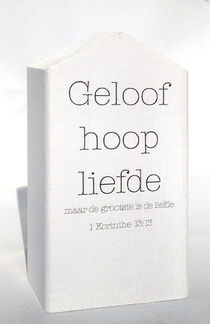 Mooi in zijn eenvoud. Staat leuk op elke tafel of vensterbank. Een leuk houten decoratiehuisje. Handgemaakt en rondom wit geverfd. Tekst op de voorkant: Geloof, hoop, liefde. Maar de grootste is de liefde. 1 Korinthe 13:13 Maat: 4,4 x 6,5 x 12 cm Materiaal: grenen hout.