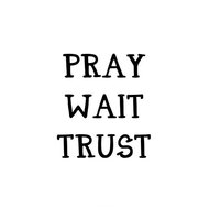 Christelijke kaart met de tekst “Pray Wait Trust” in zwart / wit.