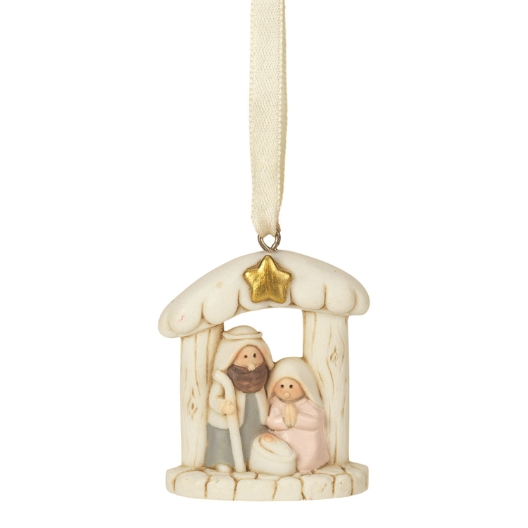 Schattige kerstboomhanger van hars met een stal en daarin Jozef, Maria en baby Jezus.